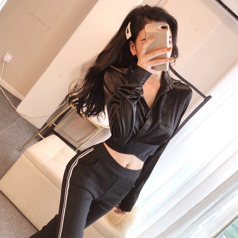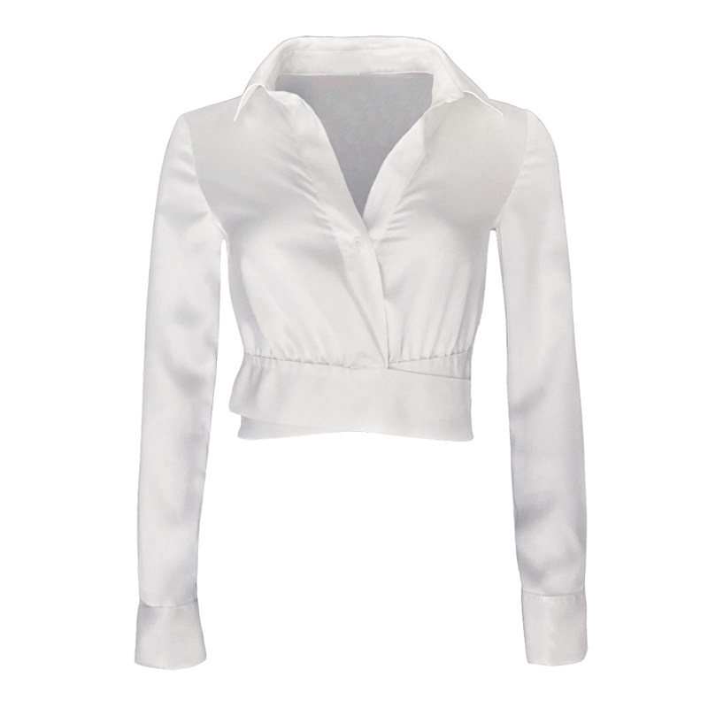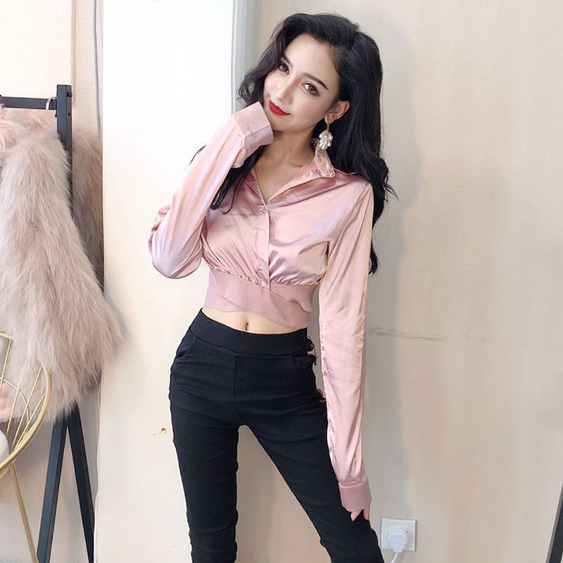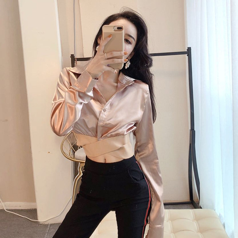 Gege family spring new temperament sexy suit collar long sleeve shirt cross crop waist short shirt top woman