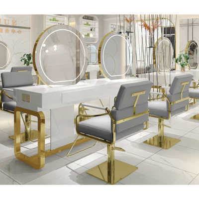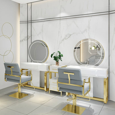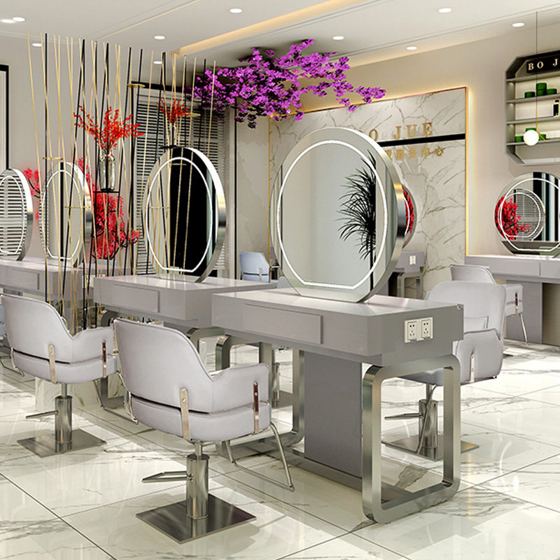 Barber shop mirror desk simple hair salon with lights hair mirror stainless steel European mirror studio makeup mirror table