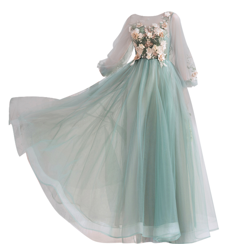 Smoke Luo jade green dinner annual meeting catwalk show host long-sleeved wedding dress evening dress wholesale 7761Q