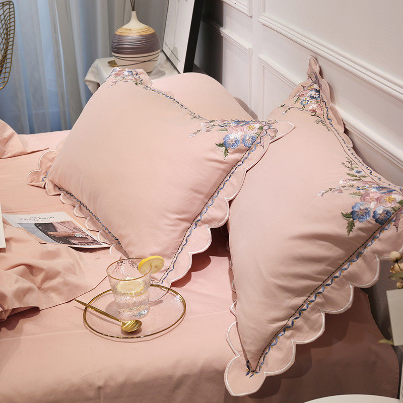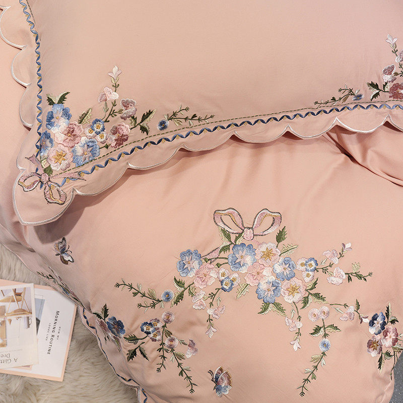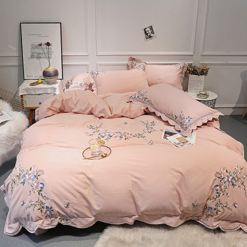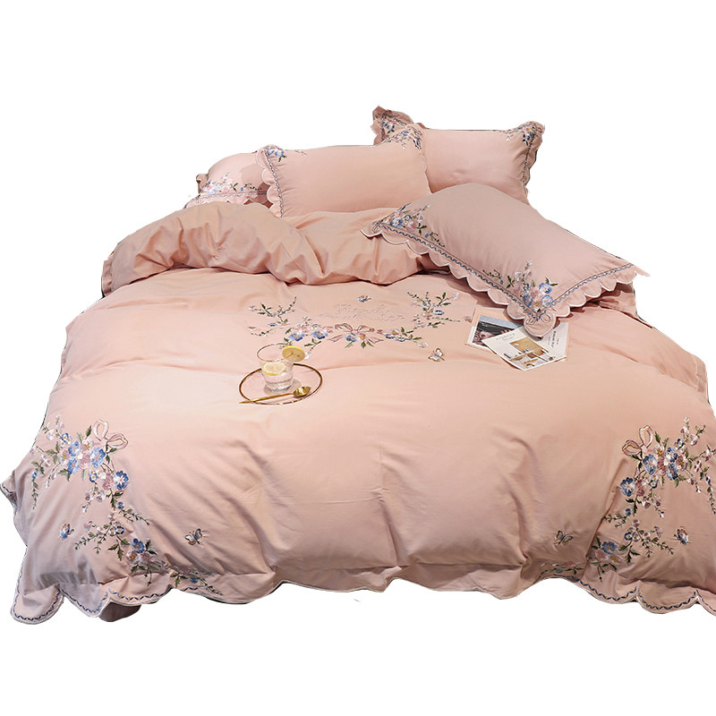 Small frescoed 60 whole cotton embroidered flowers four pieces of covered quilt cover pure cotton linen grinding powder color European-style bedding