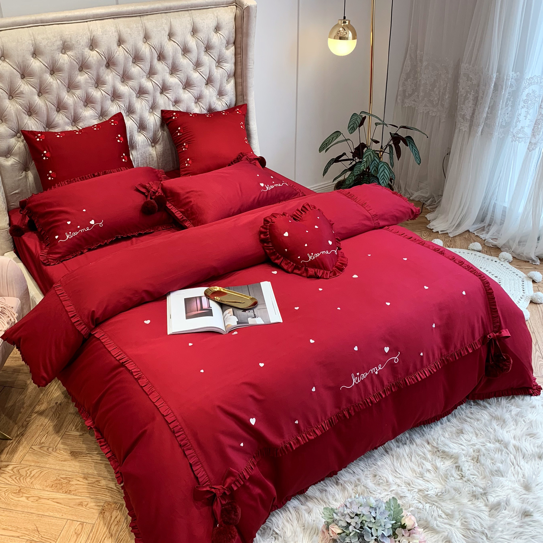 Han Style Red 60 Long Suede Cotton Wedding Celebration Four Pieces Group Brief Loving Embroidered Hair Ball Quilt Wedding Bed bedding