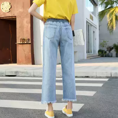 Elastic waist jeans women's straight loose wide legs autumn and winter retro high waist bf Korean version of large size student ankle-length pants tide