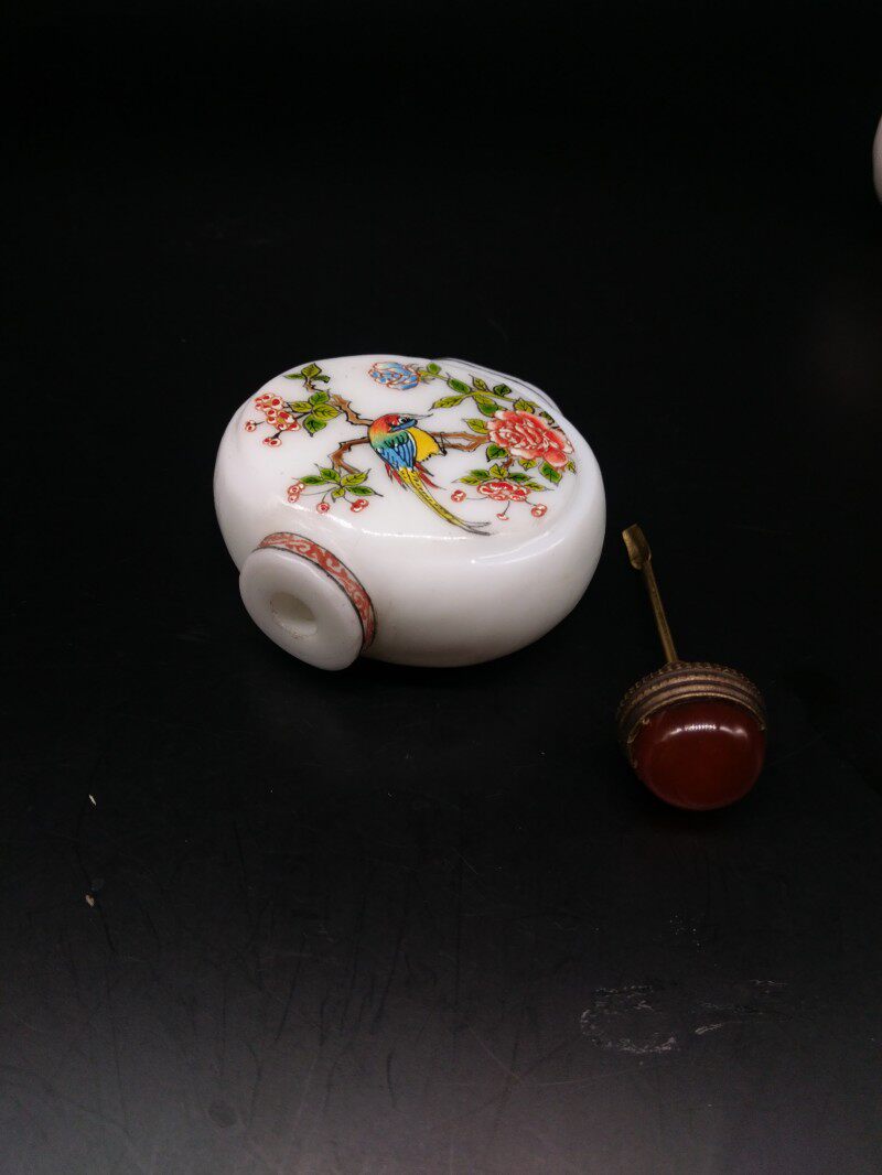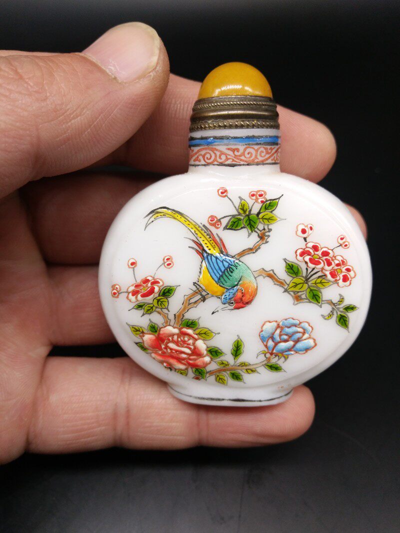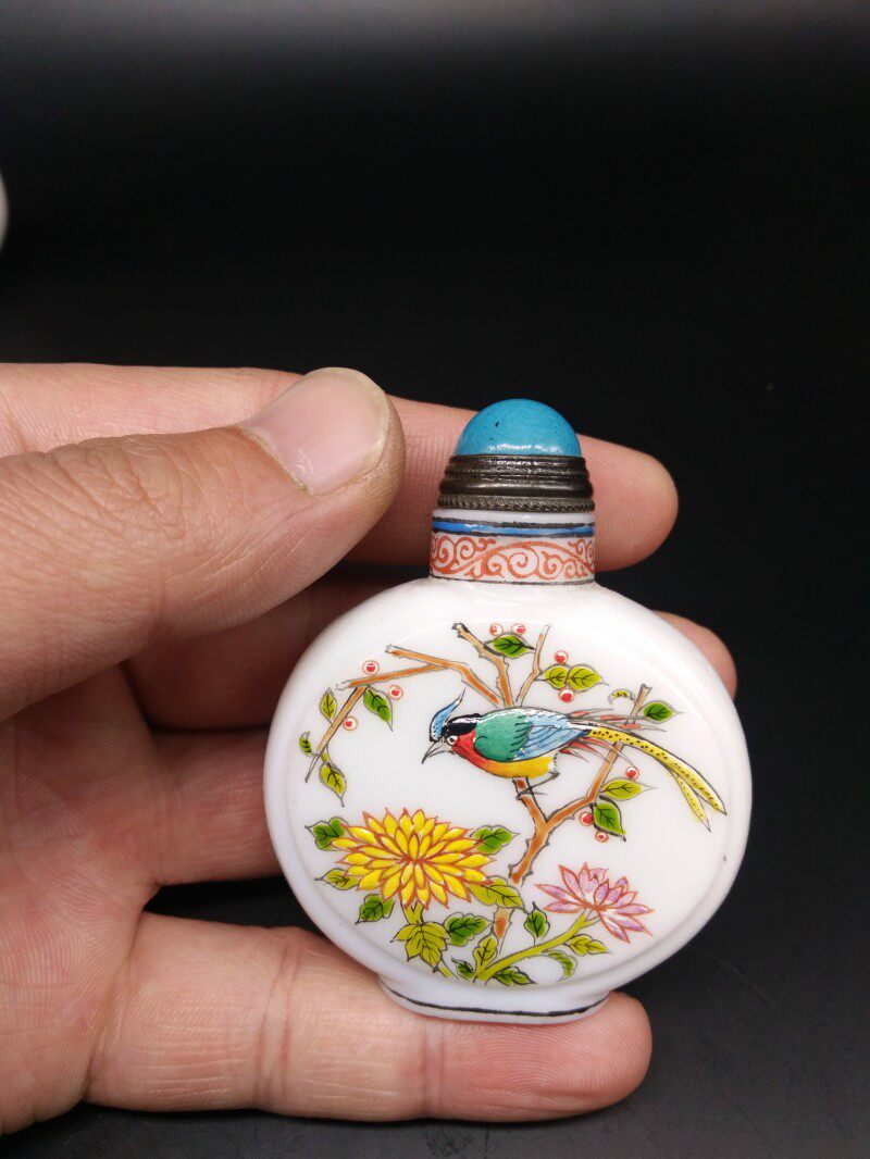 Glazed imitation white jade flat prismatic face imitation ancient snuff pot hand painted pink moon season Chrysanthemum Bird figure small swing piece Gift Items