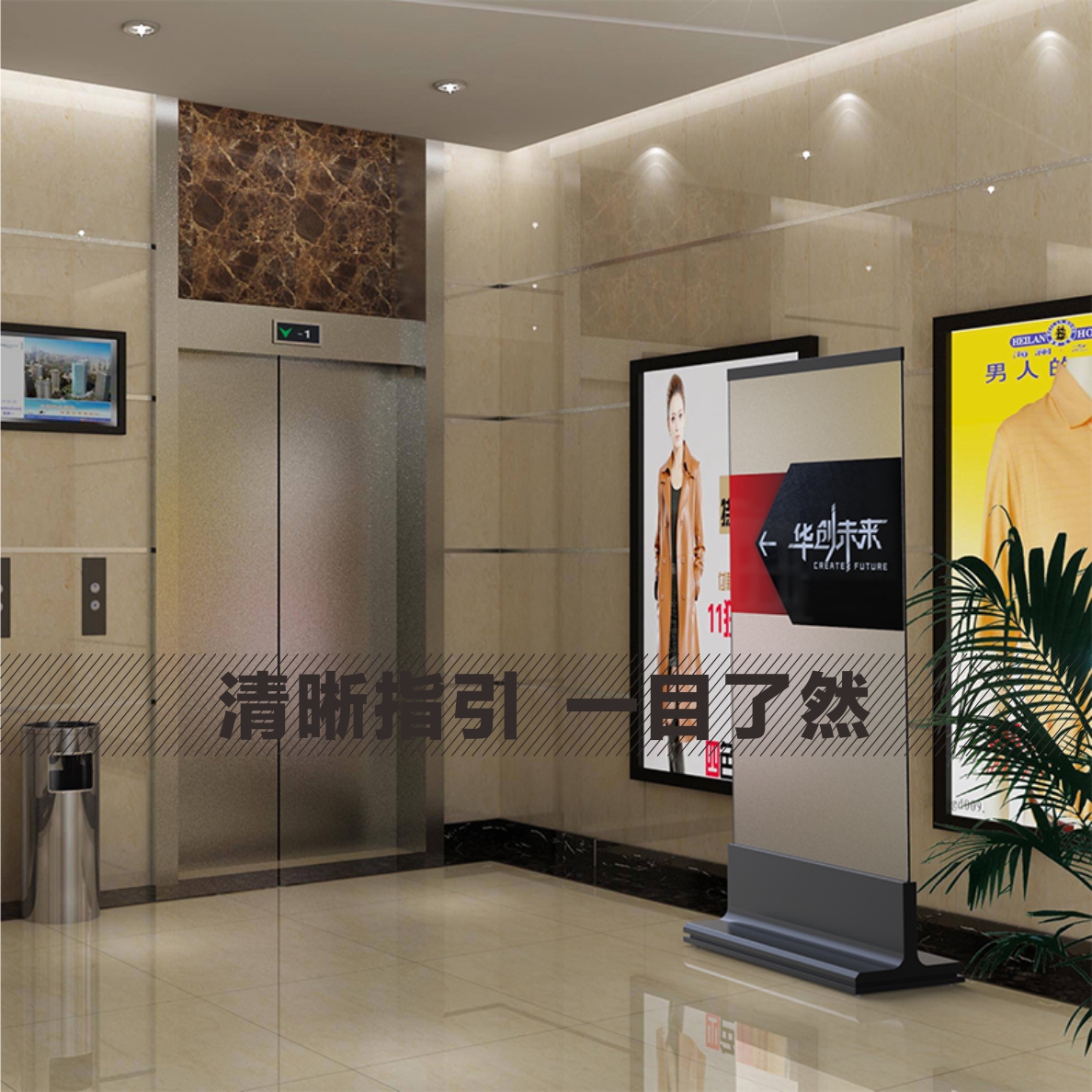 Company guidelines card pointing to card arrows indicating that GLOGO is available in the stairway lift opening removable standing exhibition stand