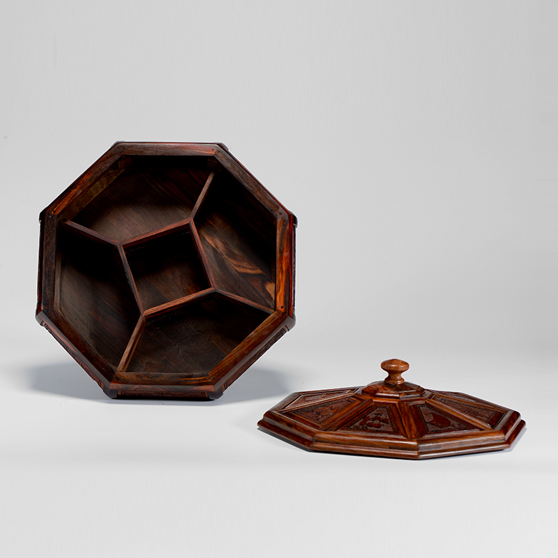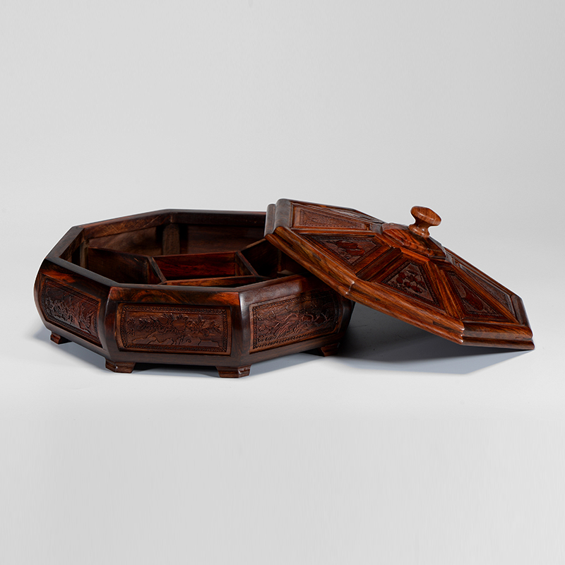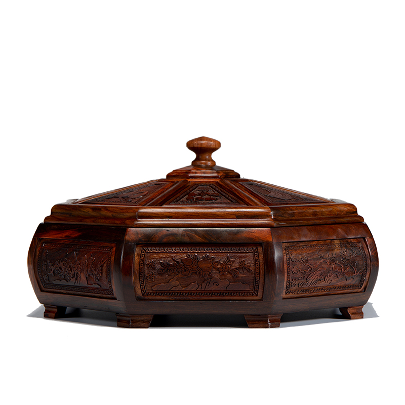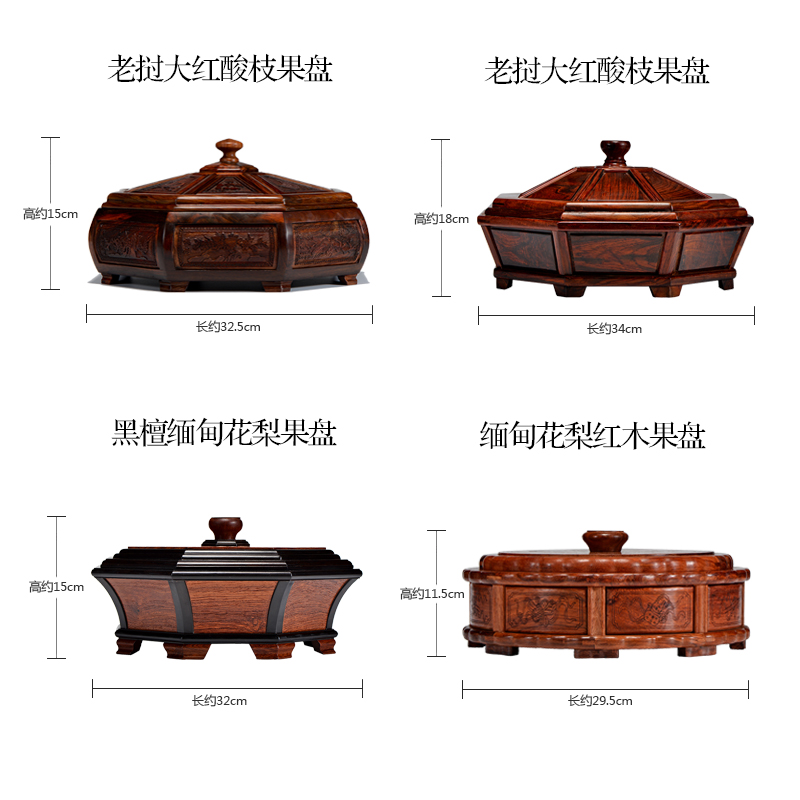 A Laos big red acid branch Cochin sandalwood dried fruit plate B ebony embedded Myanmar pear plain octagonal fruit box C Myanmar Pear round dried fruit plate D Laos big red acid branch Cochin Sandalwood candy box