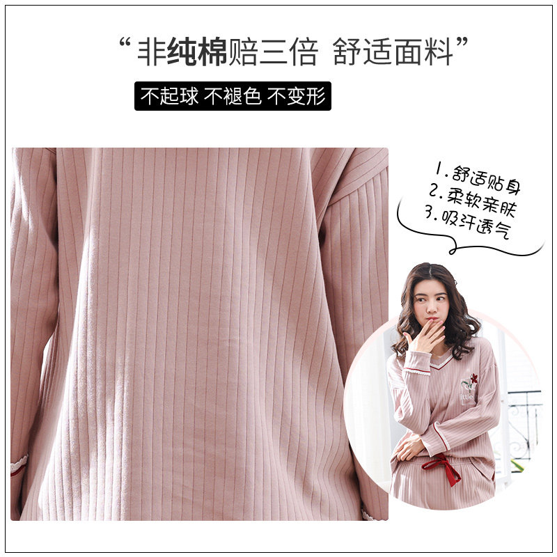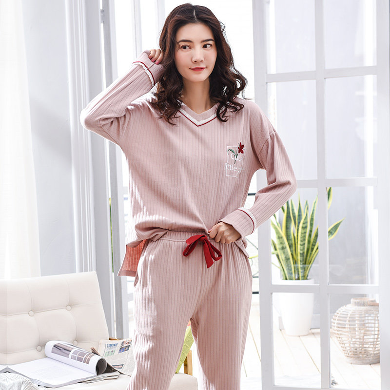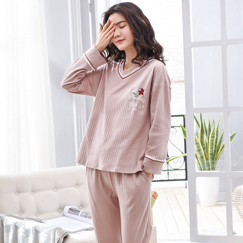 Long sleeve pyjamas female spring autumn pure cotton cover head V collar pure color embroidered Korean version fresh and sweet spring Home Residence Suit Suit