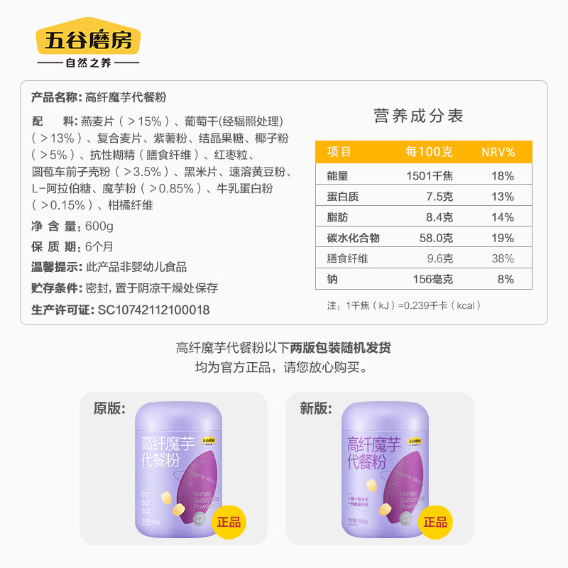 Oatmeal raisins (irradiated) compound cereal purple potato powder crystal fructose coconut powder resistant dextrin (dietary fiber) red date grain round bud psyllium shell powder black rice slice instant soybean powder L one arabino sugar konjac powder milk protein powder