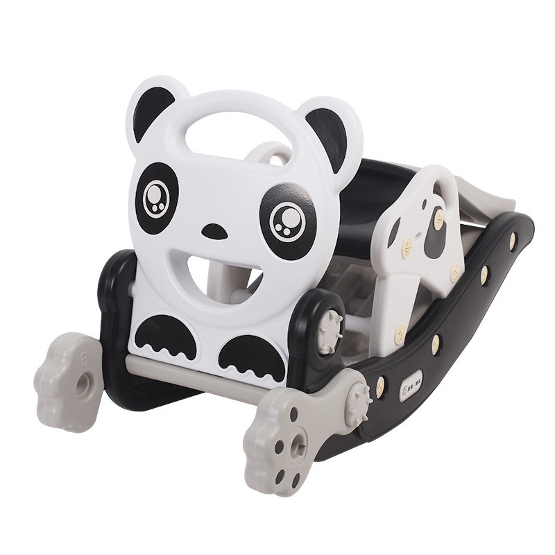 The panda is rocking the horse to the slide.