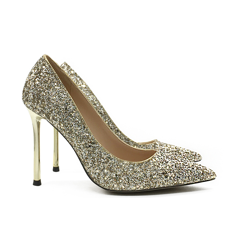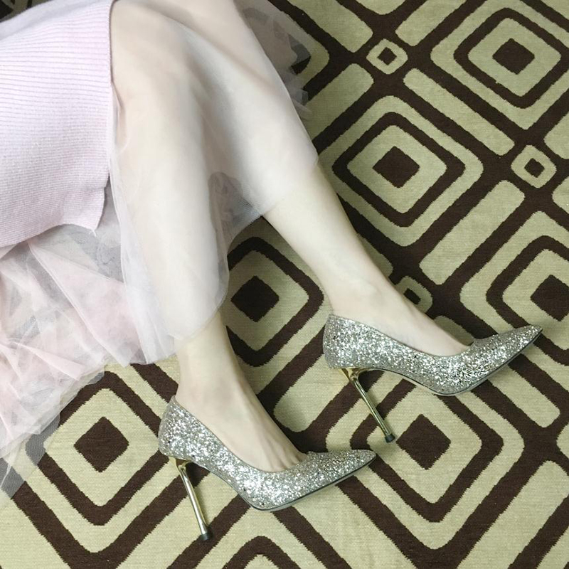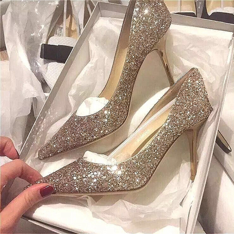 2021 new spring bridal wedding shoes women high heels net red champagne gold crystal pointed thin heel sequin single shoe