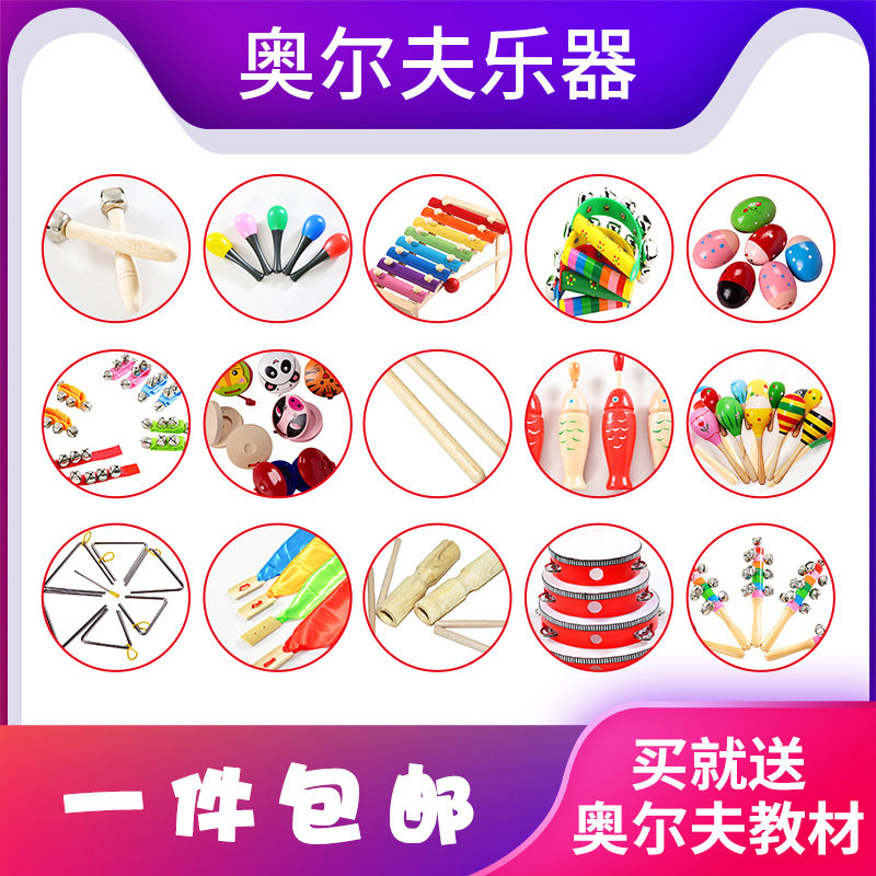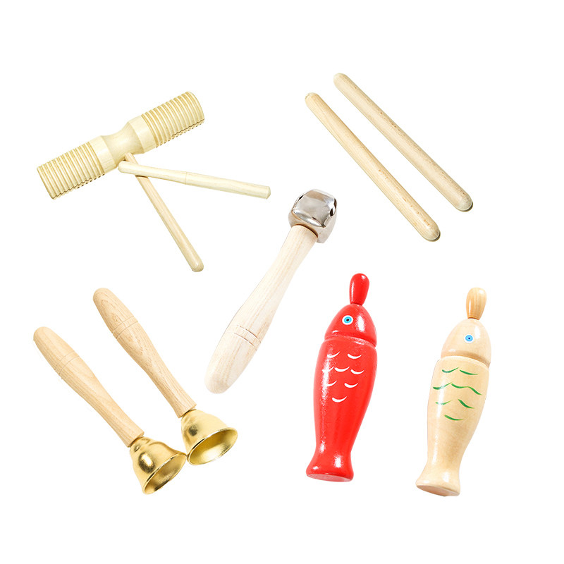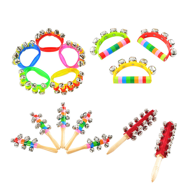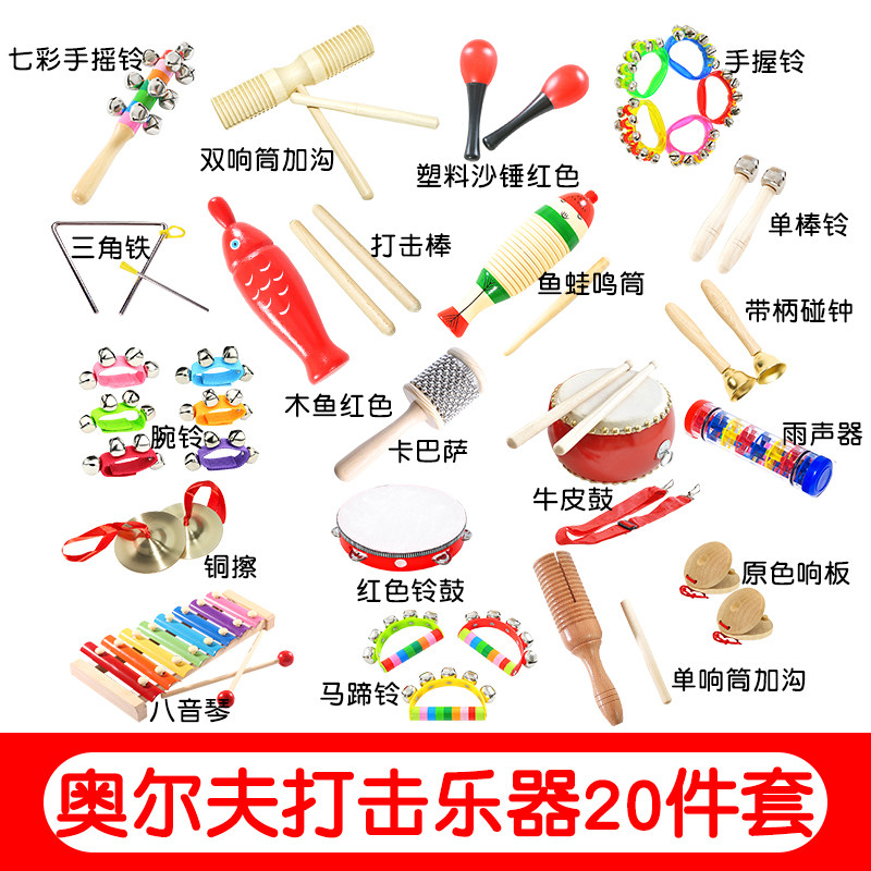 Rhythm sticks one pair ordinary double bell with rope touch bell (large) two pairs with rope touch bell (small) one pair with handle touch bell (large) two pairs with handle touch bell (small) two pairs wooden sand hammer small (color random) a pair wooden sand hammer large (color random) colorful rattle one plastic sand hammer (red) a pair of triangle iron (4 inches) a triangle iron (6 inches) a horseshoe bell pair of soundboard (primary color) a pair of gantry (animal random) a pair of wooden sand eggs a pair of eight tone pianos A primary color wooden fish A red wooden fish A 6 inch drum (red) one 8 inch with tambourine (red) one 6 inch with tambourine (wood color) one 8 inch with tambourine (wood color).