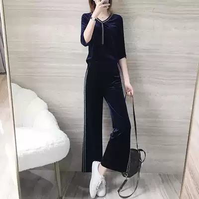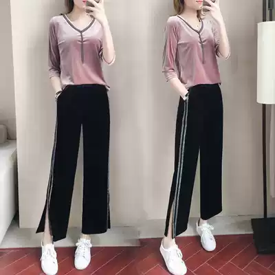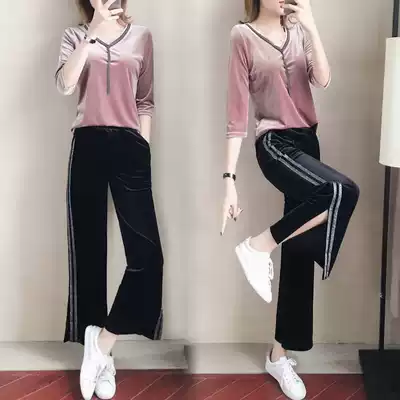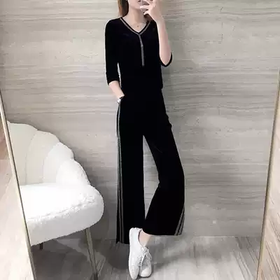 Golden Velvet Leisure Sports Set Women 2021 Spring and Autumn New Fashion Wide Leg Pants Running Clothing Temperament Two-piece Set