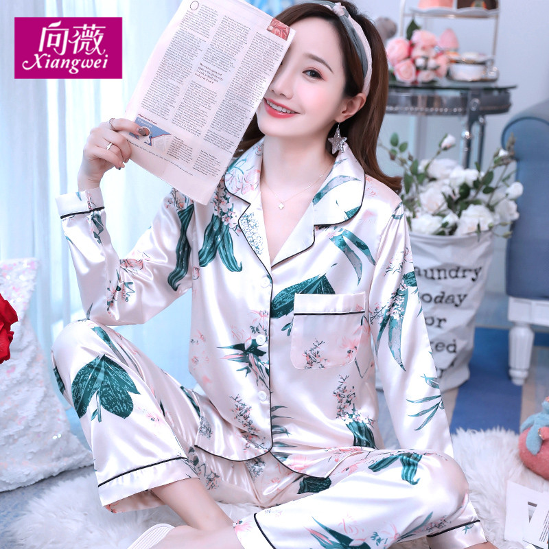 Pajamas women's spring and autumn Ice Silk thin long sleeve two-piece silk summer ladies can wear home clothes