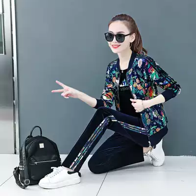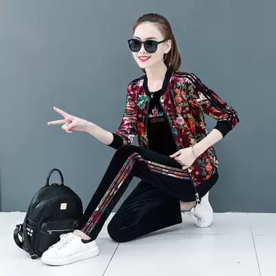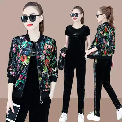 Golden velvet sports suit women's spring and autumn three-piece middle-aged and elderly women's new large size loose casual sportswear