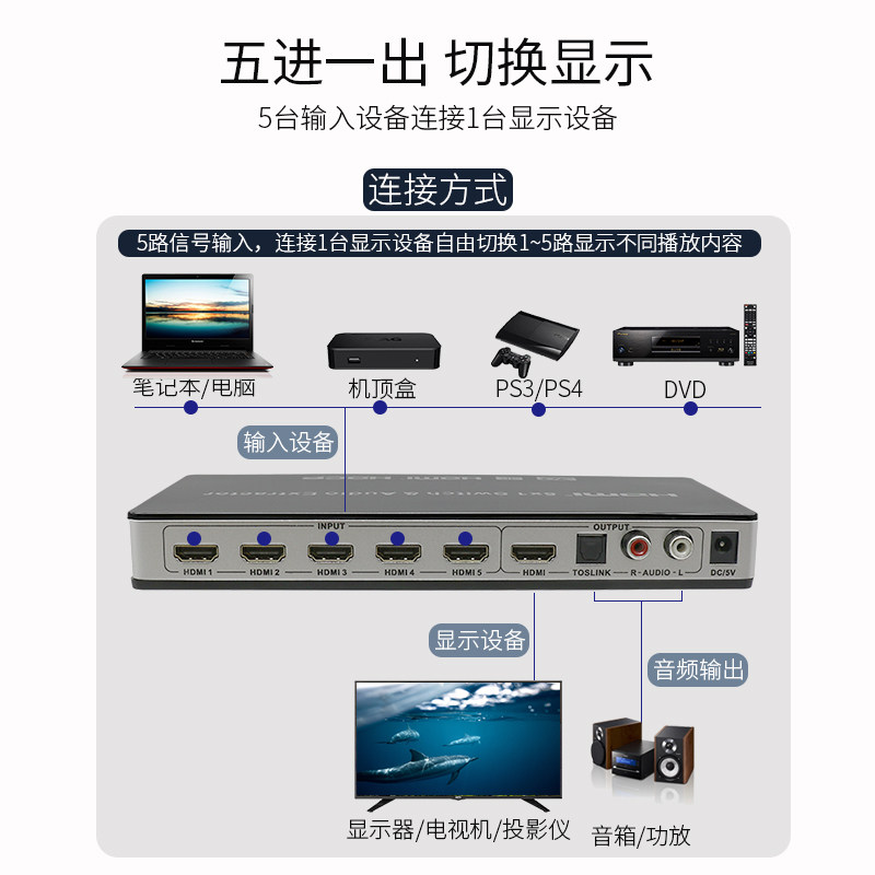 hdmi switcher 4k with audio separation 5 into 1 out of ps4 film distribution remote control 3 5 headphone optical fiber 5 1