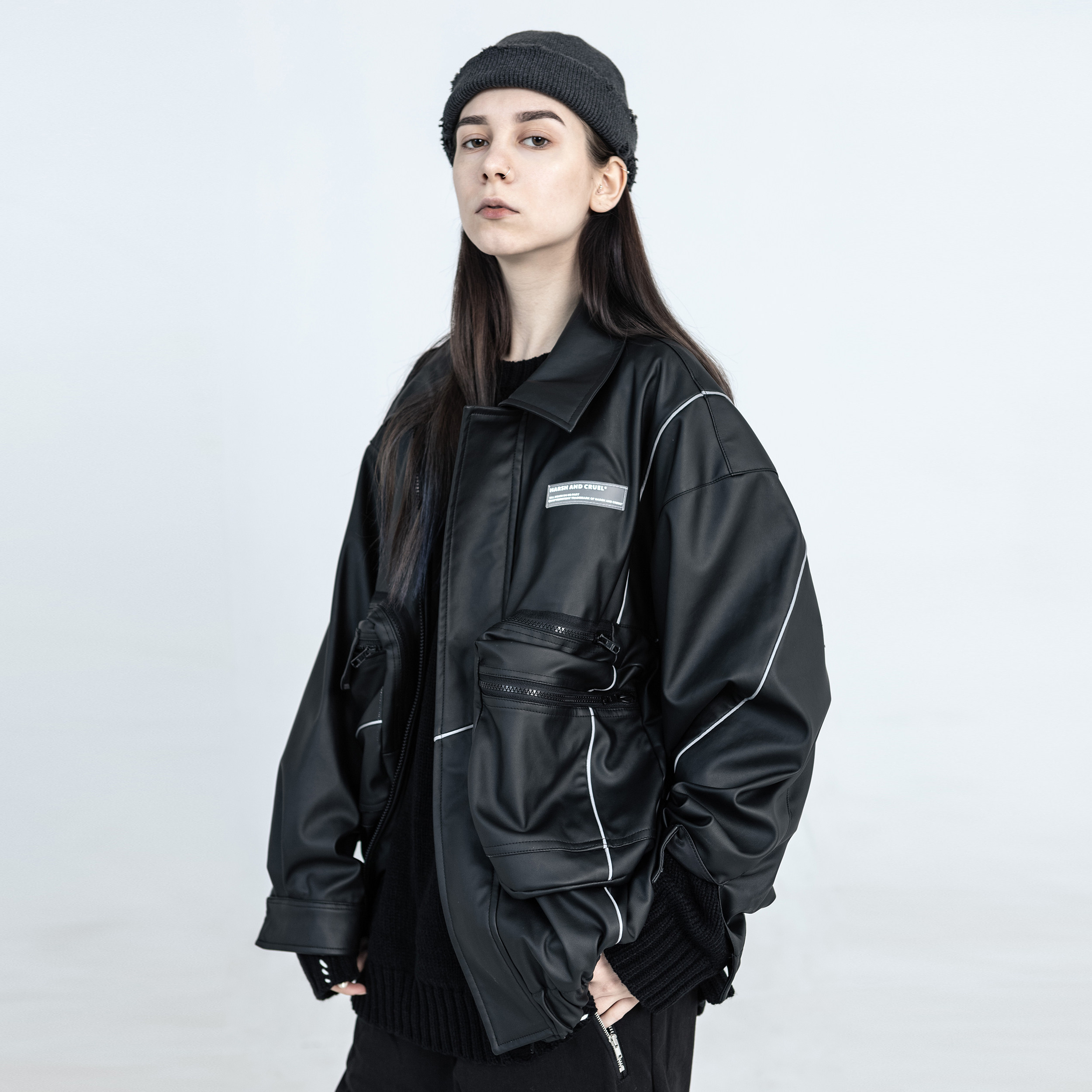harsh and cruel profile pu leather reflective strip vintage style zipper large pocket printed leather coat