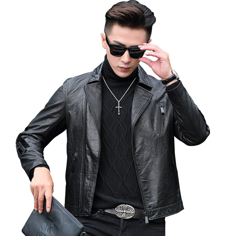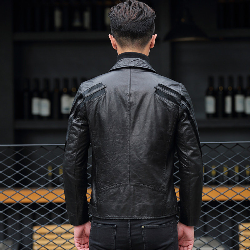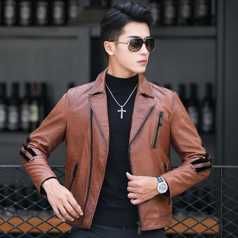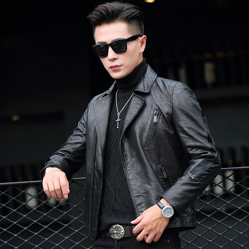 Henning men's suit collar Locomotive Leather leather clothing Male sheep leather Short and thin leather jacket Monolayer Leather Jacket Tide