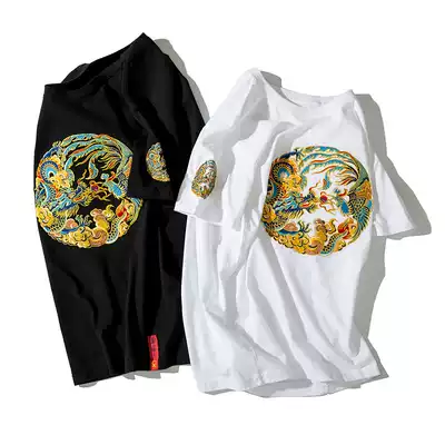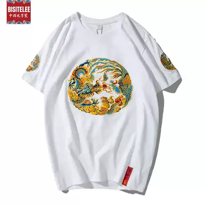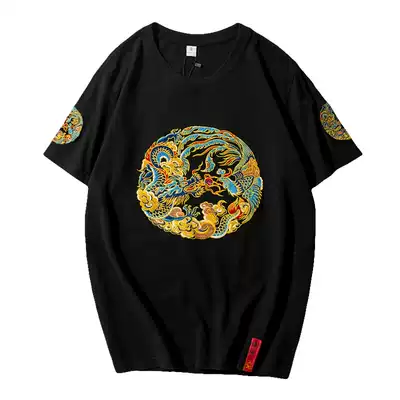 Pure cotton short-sleeved t-shirt men's 2021 new Chinese style dragon robe embroidery large size loose couple retro half-sleeved top