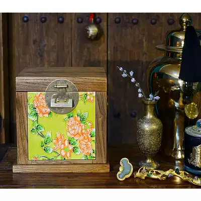 Good woman solid wood porcelain plate painting with lock jewelry box flannel multi-layer large-capacity jewelry storage box retro dressing box