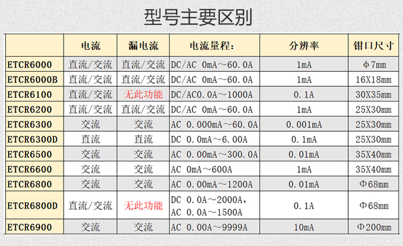 ETCR6000 AC/DC Current Leakage Current 60AETCR6000B AC/DC Current Leakage Current 60AETCR6100 AC/DC Current 1000AETCR6200 AC/DC Current Leakage Current 60AETCR6300 AC Current Leakage Current 60AETCR6300D DC Current Leakage Current 6AETCR6500 AC Current Leakage Current 300AETCR6600 AC Current Leakage Current 600AETCR6800 AC Current Leakage current 1200AETCR6800D AC/DC current 1500 2000AETCR6900 AC current Leakage current 9999AETCR6420 Clamp multimeter AC 600AETCR6450 Clamp multimeter AC/DC 1000AETCR6470 Clamp multimeter AC2000A