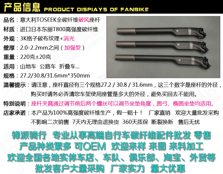 TOSEEK Breaking Wind Full Carbon Fiber Mountaineering Car Road Bike Biking seat Seat Pipe Seat Pole