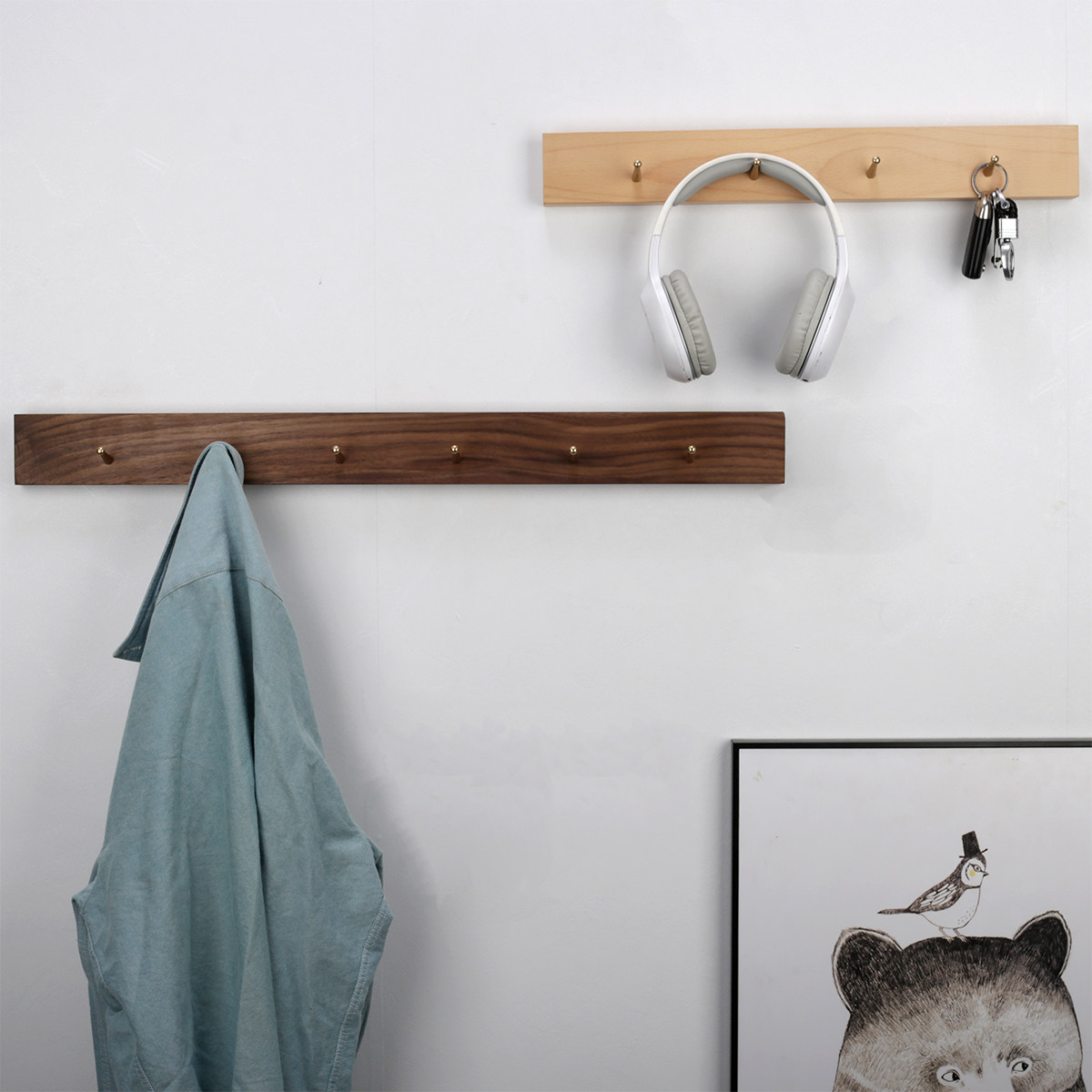 Walnut brass 4 hooks with screws and nail-free glue Walnut brass 6 hooks with screws and nail-free glue Beech brass 4 hooks with screws and nail-free glue Beech brass 6 hooks with screws and nail-free glue
