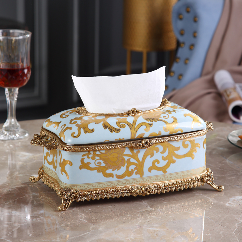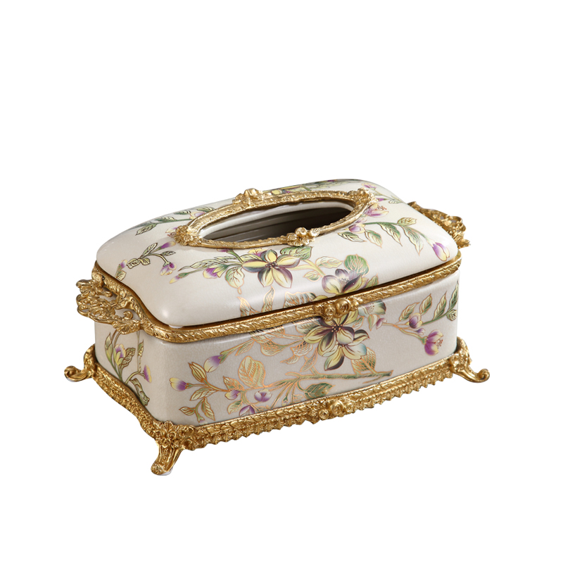 High-grade luxury ceramic with copper porcelain tissue box Retro villa soft home living room inlaid copper pumping carton ornaments