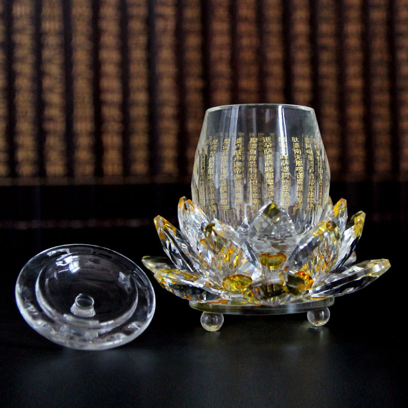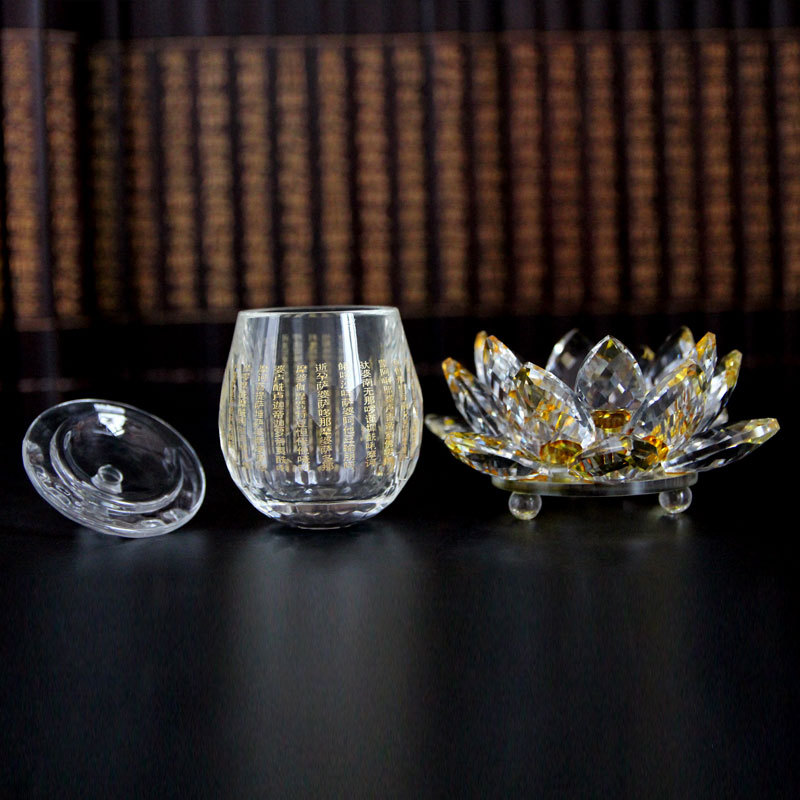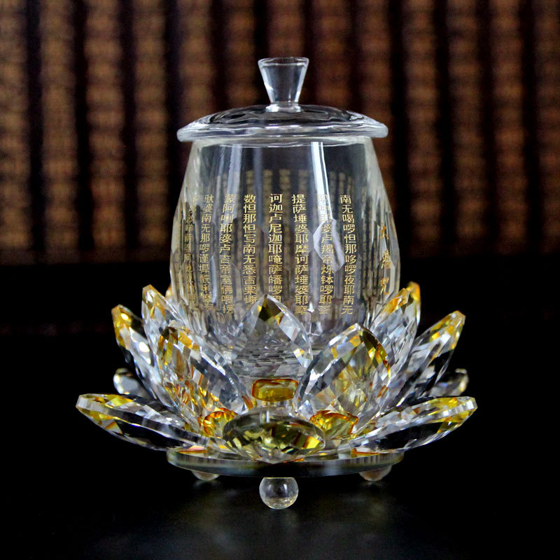 Meditation Supplies Dharma Instrument Buddha With Great Compassion Mantra Lotus Holy Water Cup Transparent Glass Crystal Water Supply Cup Water Purification Cup for Buddha