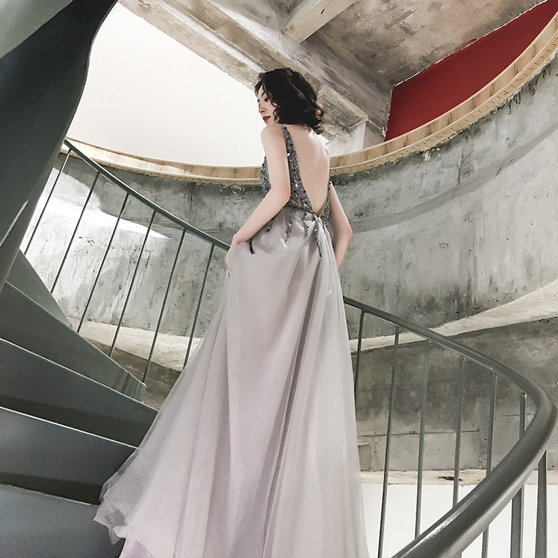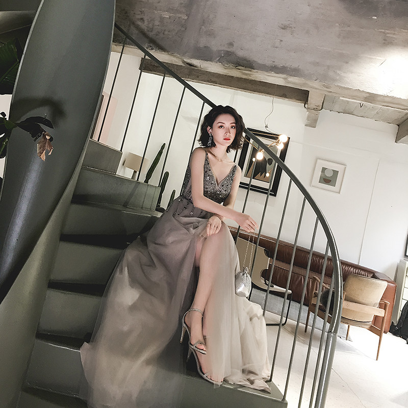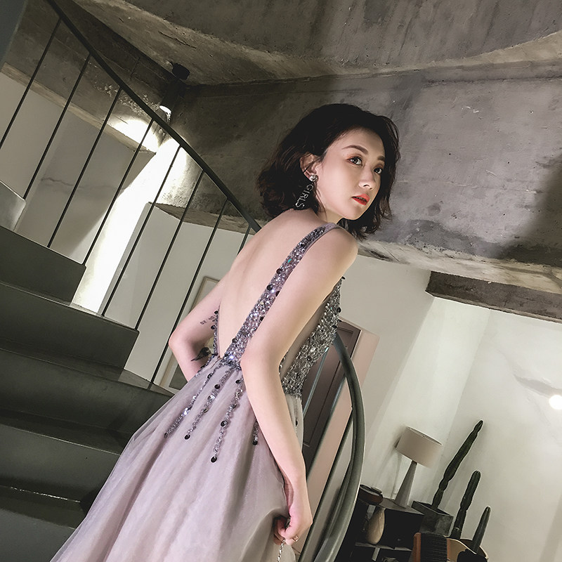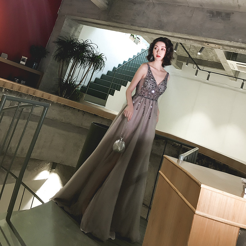 Slim V-neck sexy backless slit sequins long dress skirt banquet annual meeting party birthday party evening dress