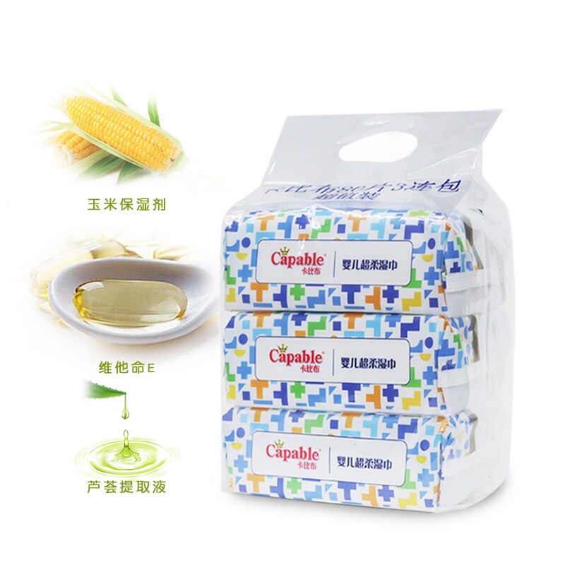 Capable cabbie ultra soft and wet wipes baby hand-mouth special newborn baby home 80 pumps * 3 packs with lid