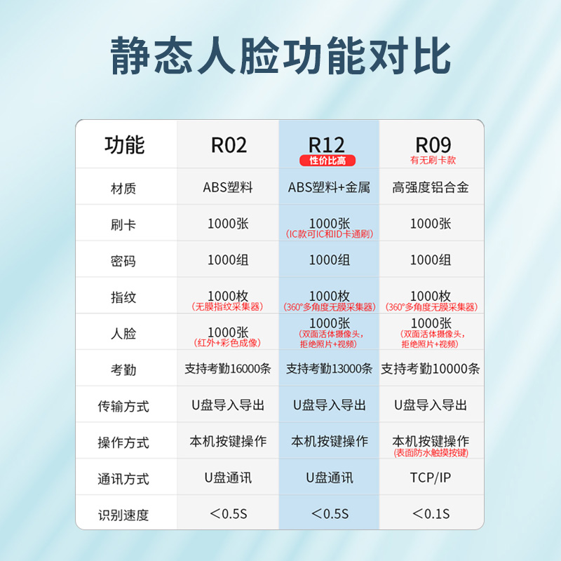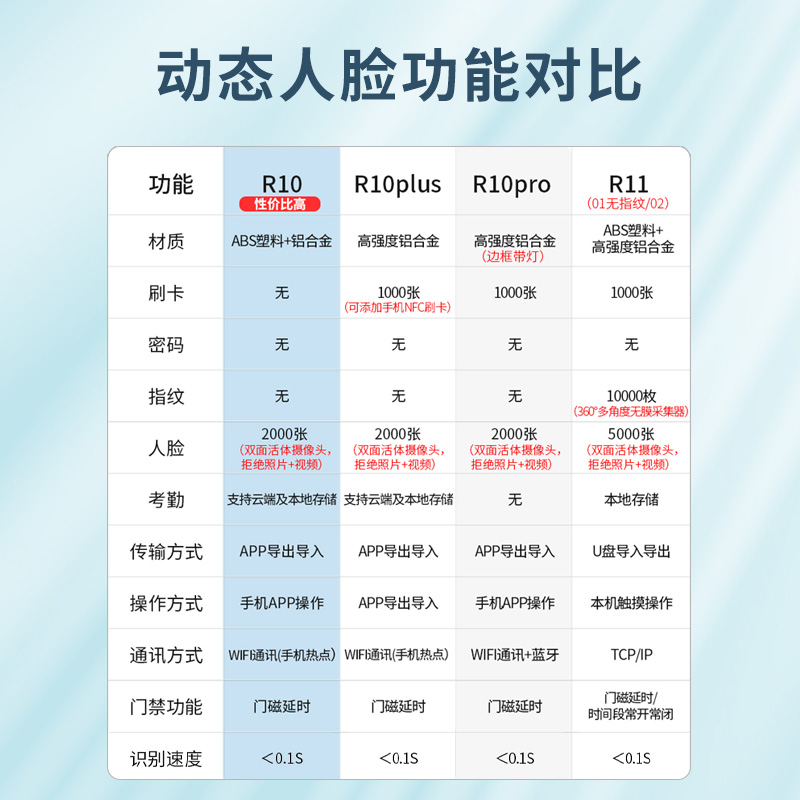 (R02 static face) ultra-thin + U disk communication (no swipe) (R02 static face) ultra-thin swipe card + U disk communication + send ID card (R10 dynamic face) APP model + WIFI communication black (R10 dynamic face) APP model + WIFI communication white (R09 static face) upgrade + TCP IP network No swipe (black) (R09 static face) upgrade swipe + TCP IP network + send ID card (black) (R09 static face) upgrade swipe model + TCP IP network + send ID card (black) (R09 static face) upgrade swipe model + TCP IP network + Send IC card (black) (adapt to the above face machine) No. 4 single door glass door (with frame without hemming) (adapt to the above face machine) No. 7 double door glass door (frameless glass without hemming on the upper frame) (adapt to the above face machine) No. 10 double door wooden door iron door (open out) need to add L bracket (R11 dynamic face) touch screen model + TCP IP network + send ID card (R11 dynamic face) touch screen model + TCP IP network + send IC card (R10puls dynamic face) APP metal frame model + WIFI communication + Send IC card (R10Pro dynamic face) APP border with light model + WIFI communication + send IC card (no attendance) (adapt to the above face machine) No. 1 single door framed glass door (can be opened inside and outside) (adapted to the above face machine) No. 2 single door wooden door iron door (opened) (adapted to the above face machine) No. 3 single door wooden door iron door (opened) need to add L-type bracket (adapted to the above face machine) No. 5 single door wooden door iron door (open inside) (adapted to the above face machine) No. 8 double door framed glass door (can be opened inside and outside) ( Adapted to the above face machine) No. 9 double door wooden door iron door (external opening) (adapted to the above face machine) No. 11 double door glass door (with framed glass without hemming) (adapted to the above face machine) No. 12 double door wooden door iron door (inner opening) (R12 static face) Cost-effective model + U disk communication + send ID card (R12 static face) cost-effective model + U disk communication (this ID and IC cartoon brush) + send IC card