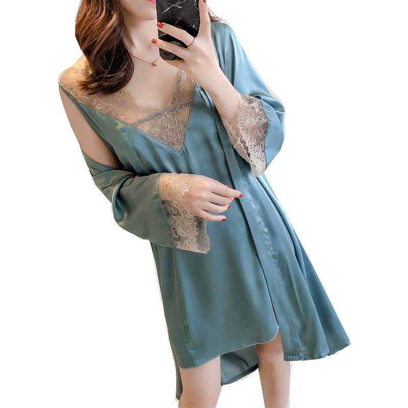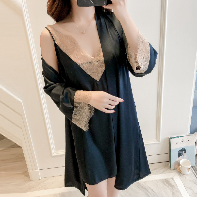 Pajamas lady summer ice silk thin sexy hanging dress two suits adult lace lace lace lace long sleeves to wear