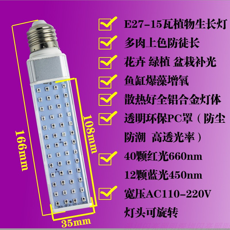 E27 screw mouth LED plant light 15W succulent coloring anti-cooking green plant potted flowers fill light seedlings red and blue 220V
