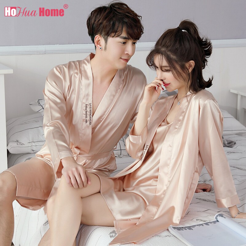 Spring and Autumn Couple Pajamas Women's Suit Men's Ice Silk Thin Nightdress Sexy Korean Home Clothes Silk