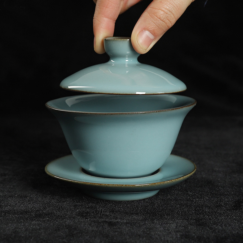 Pro-rhyming green porcelain cover bowl Gongfu tea with iron tire tea bowl Ceramic Three Bowl tea Tea Bowl to Tea Bowl