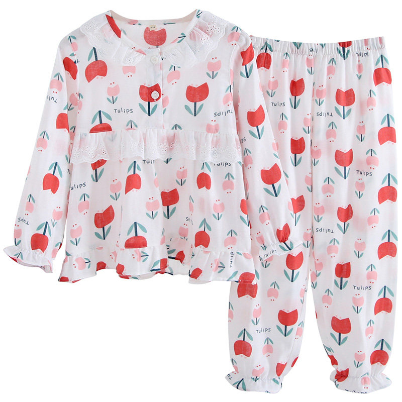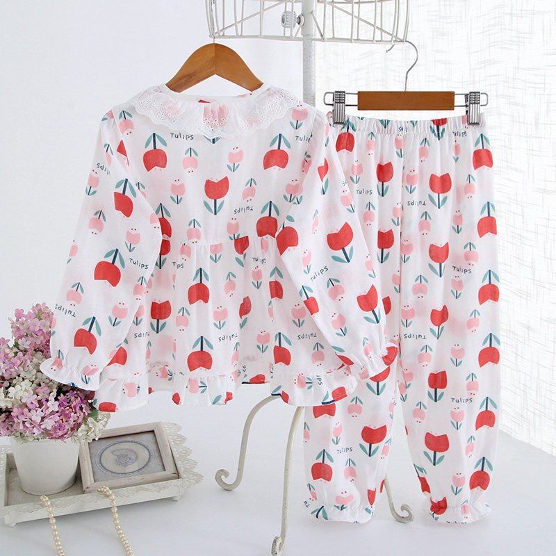 Tulip mother and daughter parent-child pajamas long-sleeved trousers suit Spring and summer thin cotton double-layer gauze home clothes