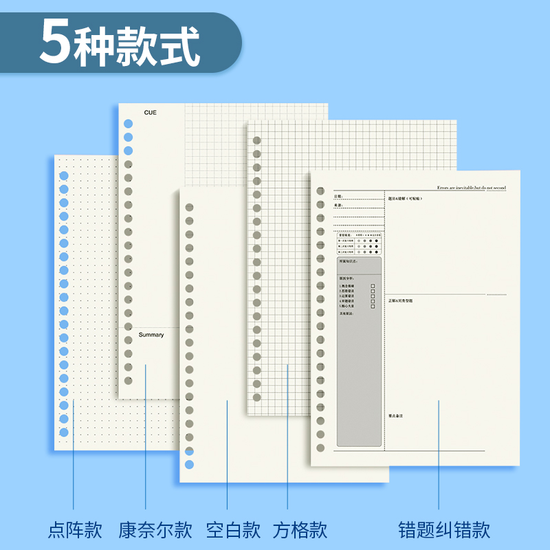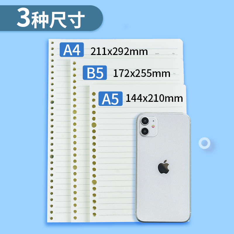 A5 Horizontal Core 4 total 240 A5Cornell Inner Core 4 total 240 A5 dot matrix cores 4 total 240 A5 mesh cores 4 total 240 A5 error correction cores 4 total 240 A5 blank cores 4 total 240 A5 shell 20 holes with straps 2 A5 shells one + A5 horizontal wire replacement cores 2 A5 replacement cores mixed 4 books (horizontal core + grid core + blank core + Cornell core) B5 horizontal wire inner core 3 total 180 B5 Cornell inner core 3 total 180 B5 mesh cores 3 books total 180 B5 error correcting cores 3 total 180 B5 blank cores 3 total 180 B5 shells 26 holes with straps 2 B5 shells one + B5 horizontal wire replacement cores 2 B5 replacement cores 4 books (horizontal line + grid + Cornell + blank) A4 horizontal wire inner cores 3 books total 180 pieces A4 mesh inner cores 3 books total 180 pieces A4 Cornell inner cores 3 books total 180 sheets A4 core mixing 3 books (horizontal line + grid + Cornell A4 shell 30 holes with straps 2 A4 shells one + A horizontal line for the core