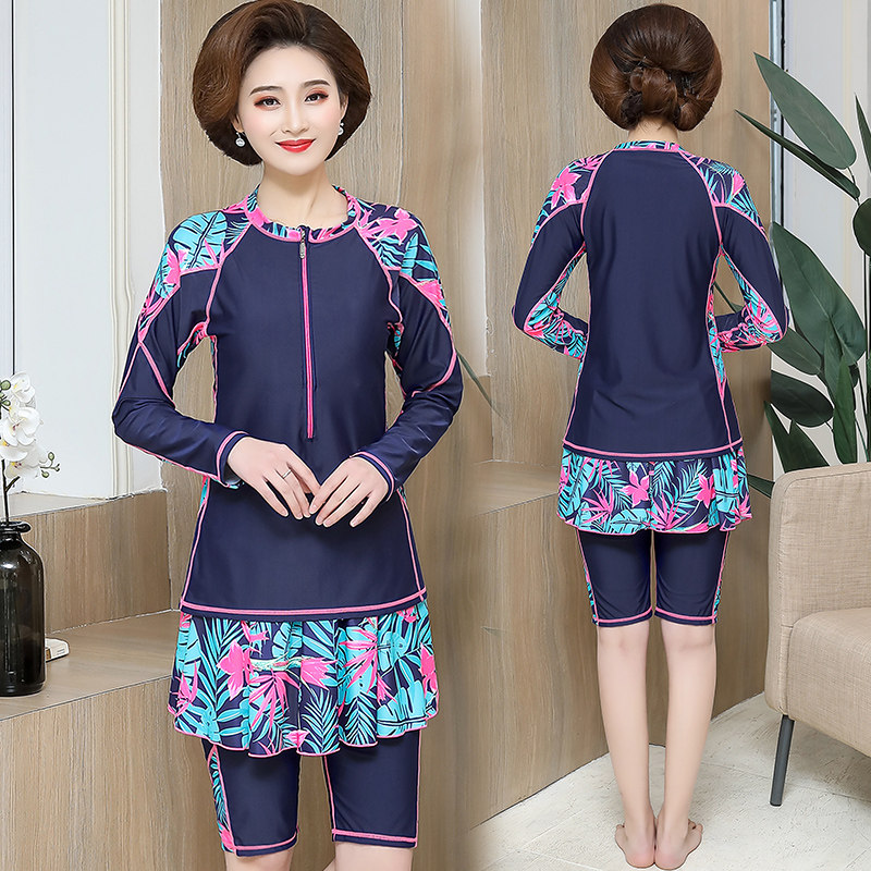 2021 hot spring long sleeve swimsuit women's fat plus size two-piece skirt five-point pants two-piece conservative swimming suit