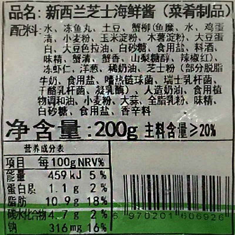 Frozen food bag New Zealand cheese seafood sauce 200g