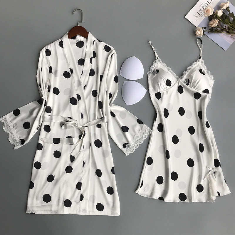 Sexy Pajamas Women Summer Sling Polka Dot Nightdress with Chest Pads Gathering Two Piece Suit Ice Silk Adult Lace Lace