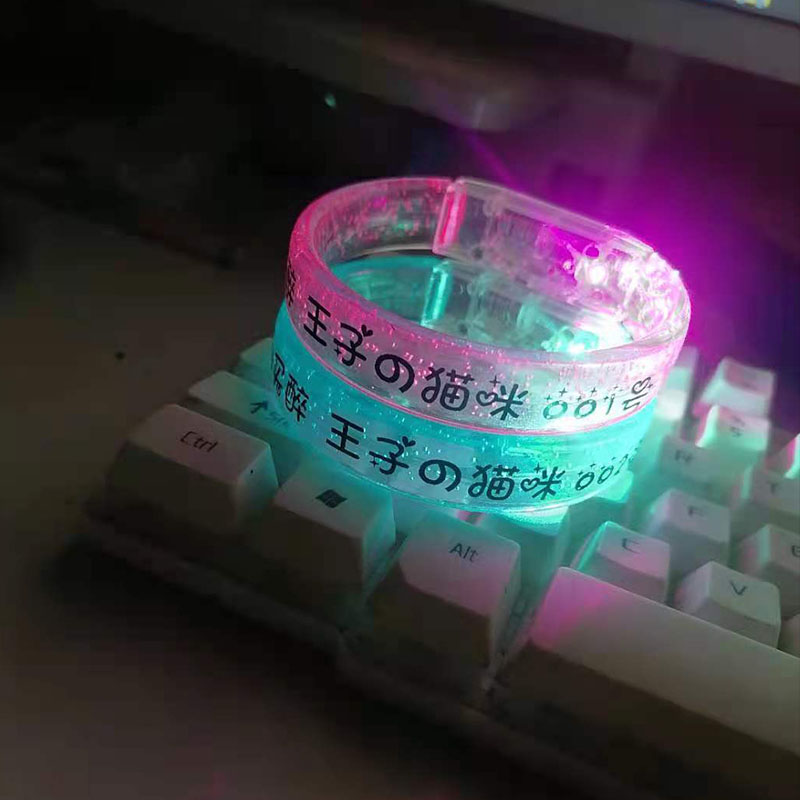 Red acrylic bracelet (red ring with red light) blue acrylic bracelet (blue ring with blue light) green acrylic bracelet (green ring with green light) white acrylic bracelet (white ring with white light) yellow acrylic bracelet (