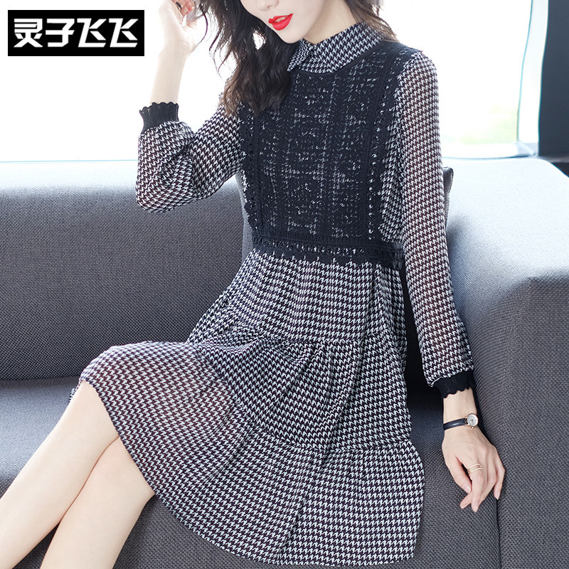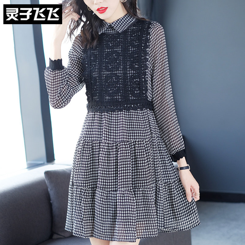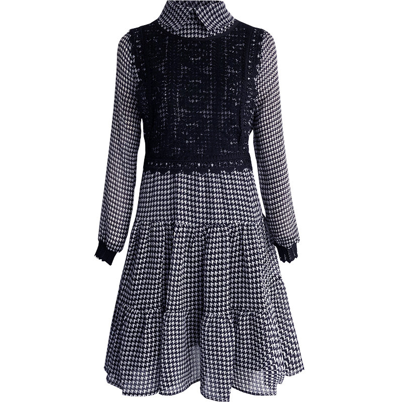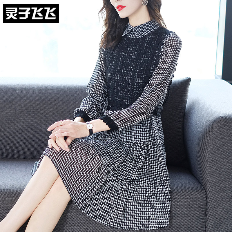 2019 spring new light familiar style fake two-piece slim fit knitted vest houndstooth lapel shirt dress