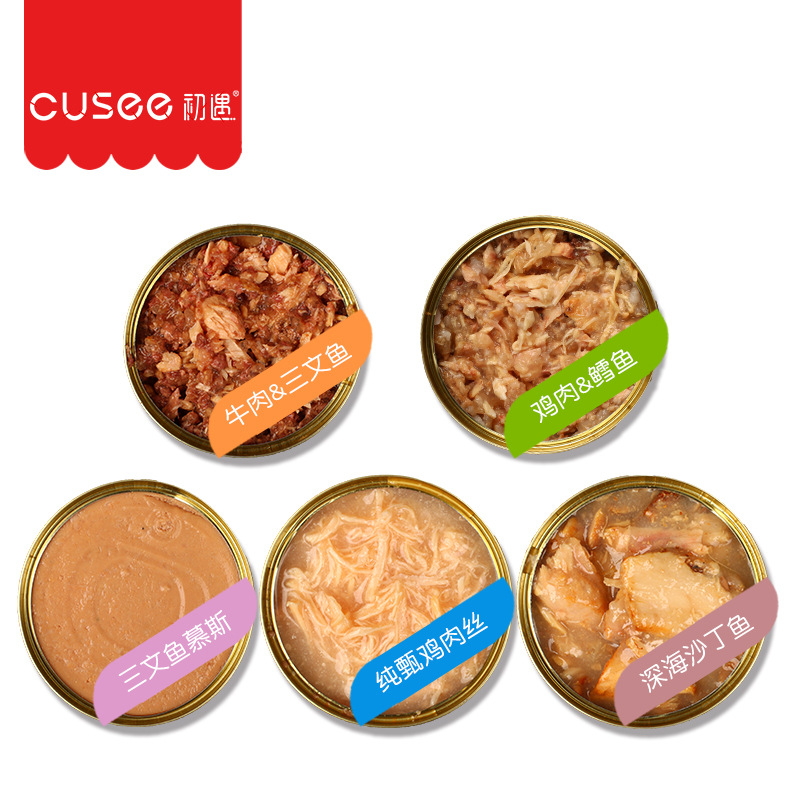 Chicken mousse (375g can), beef mousse (375g can), chicken shreds, cod (170g can), beef salmon (170g can), sardines, mackerel (1