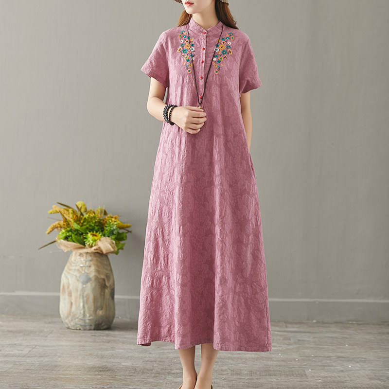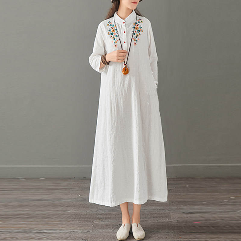 Qili 2019 autumn new female art embroidery stand collar jacquard bottom slim cotton and linen long dress