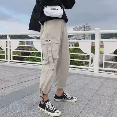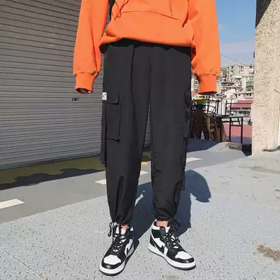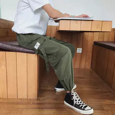 ins overalls men's national tide beam feet tide brand functional French straight tube drop sense wide leg Korean version of the trend nine-point pants