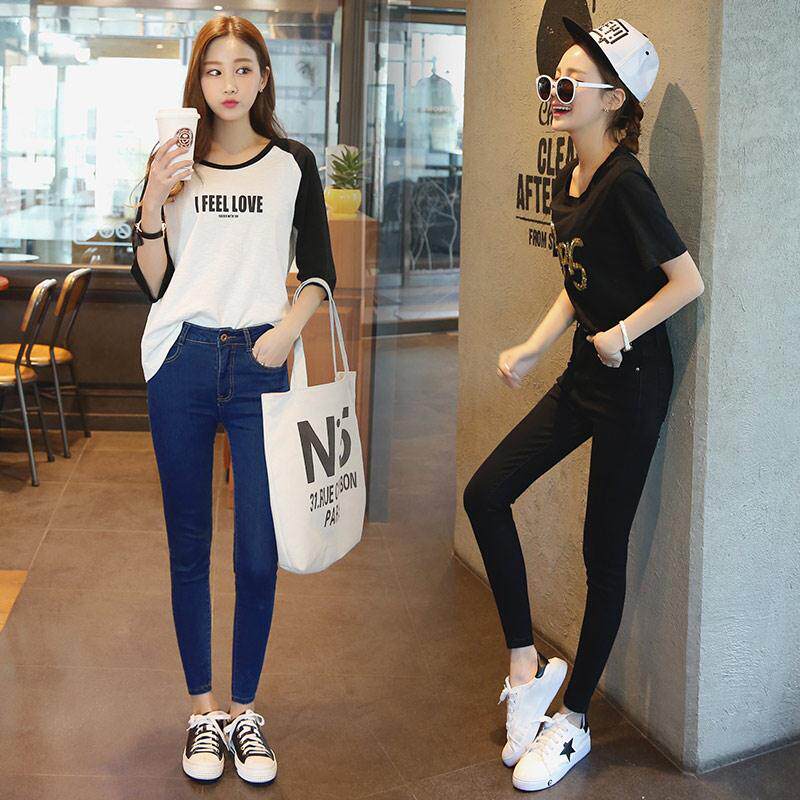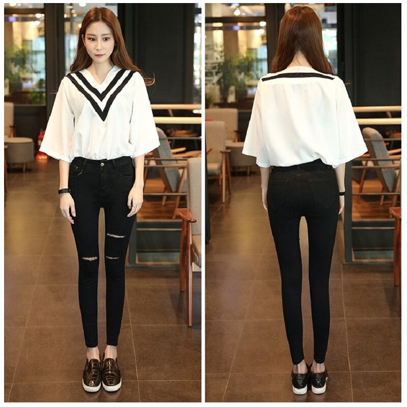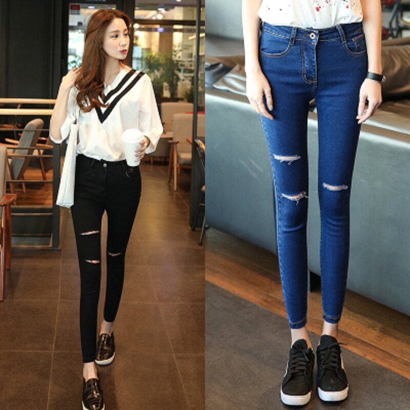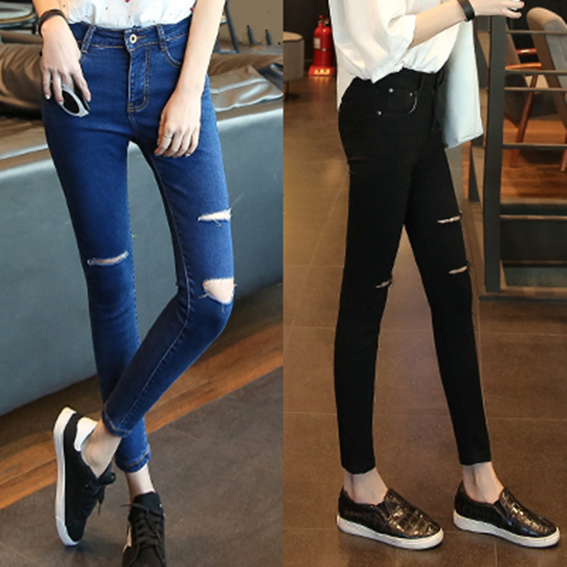 South Korea's autumn new high-waist jeans woman with slim elastic small foot pants Korean version knee breaking hole 90% pants-Taobao