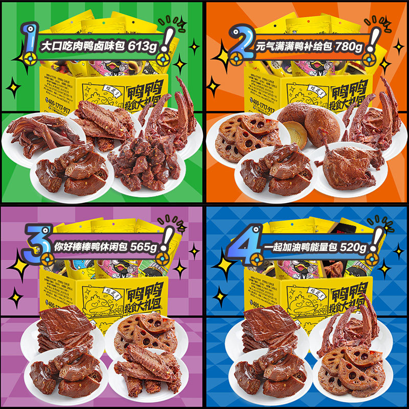Eat meat duck 703g(5 bags of whole meat) Full of vitality duck 730g(3 meat 2 vegetarian) Hello Bang Bang duck 565g (2 meat 2 vegetarian) Come on together duck 520g (2