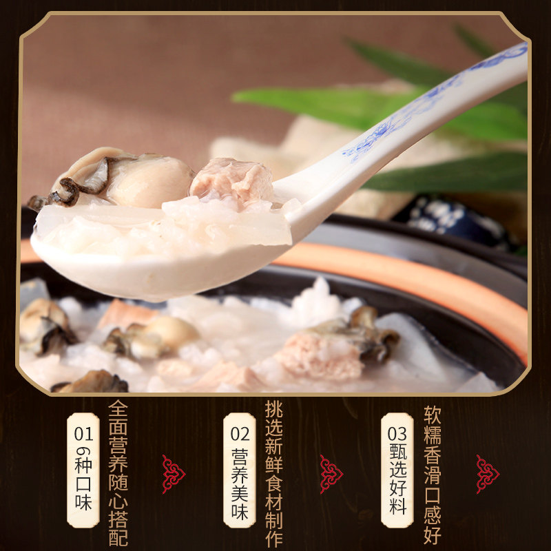 Black rice and longan porridge*1 Red dates and longan porridge*1 Lotus seed porridge*1 Squid porridge*1 Dried oyster porridge*1