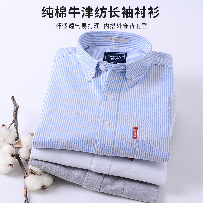 Romon pure cotton oxford spinning casual shirt men's 2021 autumn new young and middle-aged long-sleeved vertical pattern shirt