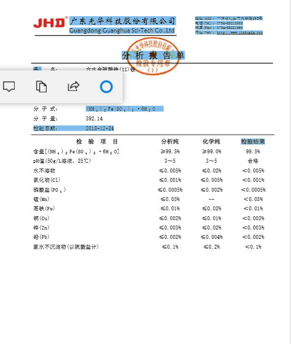 Hua Guanghua Guanghua Hexahydrated Ferrite Sulfate (II) Ammonium Sulfate (AR500g)