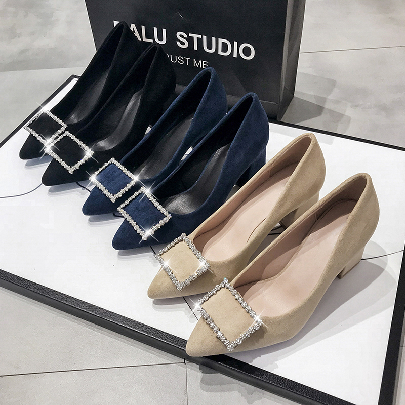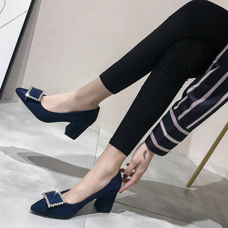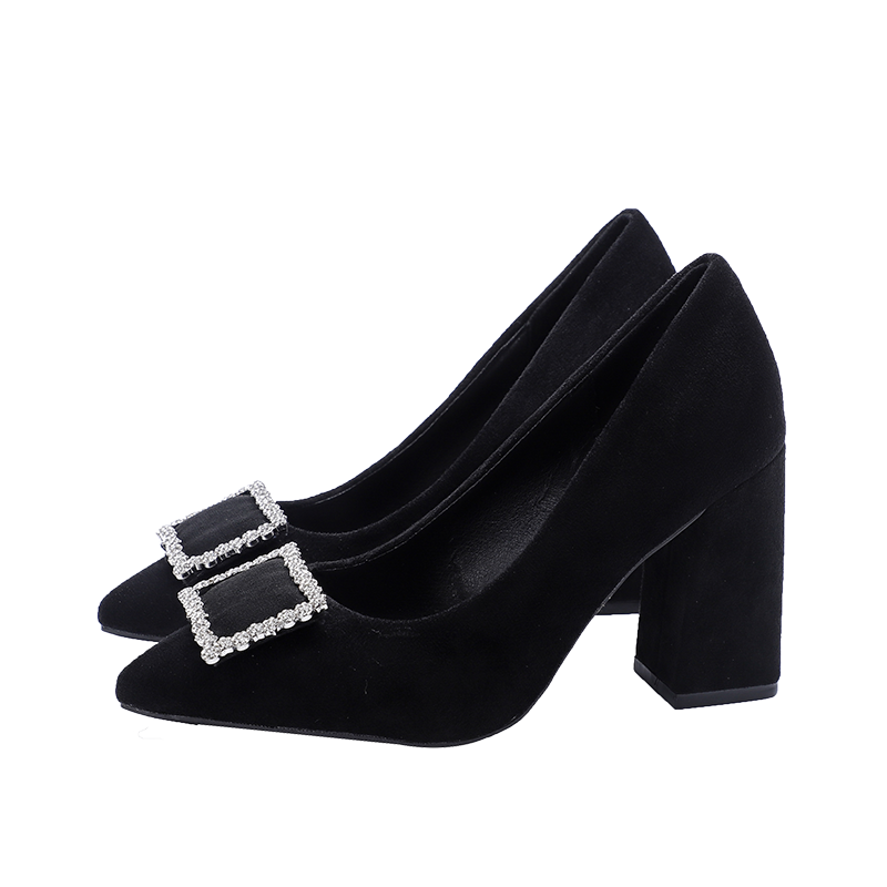 Black High Heel Shoe Woman Coarse Heel Pointed Water Drill Single Shoe Light Mouth Career Suede 2022 Spring New Fashion Work Shoes